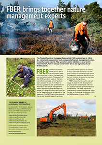 The Finnish Board on Ecological Restoration FBER, established in 2004, is a nationwide cooperation body composed of nature management actors, researchers and experts. The operations cover habitats on land and in inland waters, both in nature conservation areas and agricultural and forestry lands.