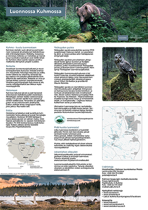 Kuhmon metsät, suot, järvet ja joet koskineen tarjoavat ainutlaatuiset mahdollisuudet virkistäytymiseen. Retkeily, marjastus ja sienestys, kalastus ja metsästys ja monet muut luontoharrastukset ovat täällä lähellä. Kuhmon rikas luonto tarjoaa unohtumattomia elämyksiä ympäri vuoden.