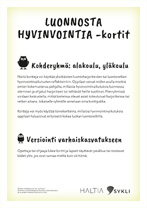 Korttien kohderyhmä on peruskoulun oppilaat, mutta ne ovat sovellettavissa myös muille kohderyhmille. Kortteja voi käyttää yksittäisten luontoharjoitteiden tai luontoretken hyvinvointi- ja oppimisvaikutusten reflektointiin. Oppilaat voivat niiden avulla miettiä omien kokemustensa pohjalta, millaisia hyvinvointivaikutuksia ja minkälaista oppimista luonnossa oleminen ja ohjatut harjoitteet tai tehtävät heille tuottivat. Kortteja voi käyttää myös toive- ja tavoitekortteina: millaisia hyvinvointivaikutuksia ja minkälaista oppimista oppilaat haluaisivat erityisesti kokea luokan luontoretkillä.