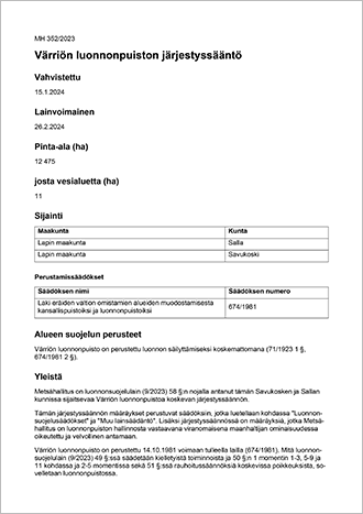 Metsähallitus on luonnonsuojelulain (9/2023) 58 §:n nojalla antanut tämän Savukosken ja Sallan kunnissa sijaitsevaa Värriön luonnonpuistoa koskevan järjestyssäännön.